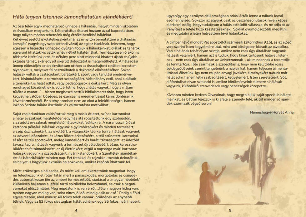 Öröm számunkra, hogy a reformáció, valamint a hálaadás ünneplése mostanra részévé vált a baptista iskolák életének. Az idei tanévben is elkészült a kiadvány, amely segítségetekre lehet az ünneplésben. A kiadvány a Budapesti Innovatív Technikum, Gimnázium és Szakképző Iskola tanulójának, Bódi Bálint Bencének a munkája.